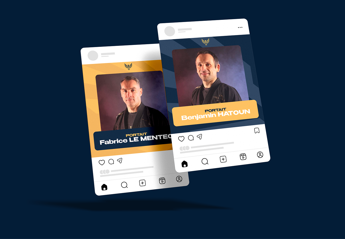 La direction artistique s’est construite progressivement autour d’un symbole puissant : le Phénix. Après avoir testé plusieurs pistes, lion, emblèmes guerriers, approches typographiques, le Phénix s’est imposé comme la métaphore la plus juste du club : la progression, la résilience, l’ascension. Les couleurs, bleu nuit et jaune doré, ont été modernisées pour installer une atmosphère sérieuse mais chaleureuse, capable de parler à des débutants comme à des compétiteurs avancés. Le logo final, entièrement original, combine lignes dynamiques et structure robuste, pensé pour fonctionner aussi bien sur des textiles que dans des environnements numériques.